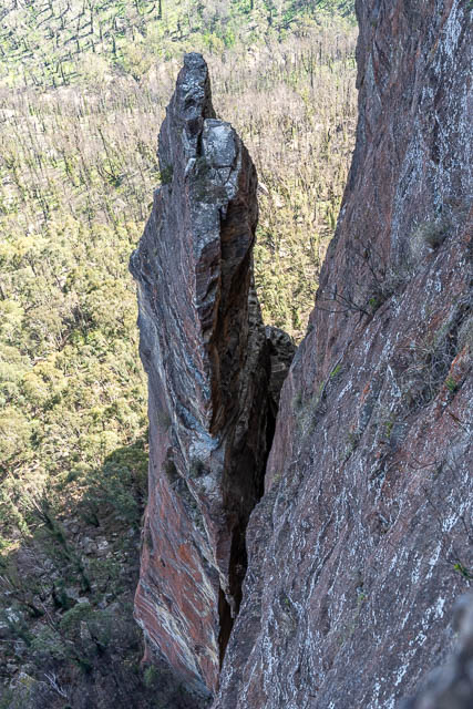 Just past a corner, we could look down (carefully!) and see the Lost Pillar below. There were some bolts nearby used by rock climbers.