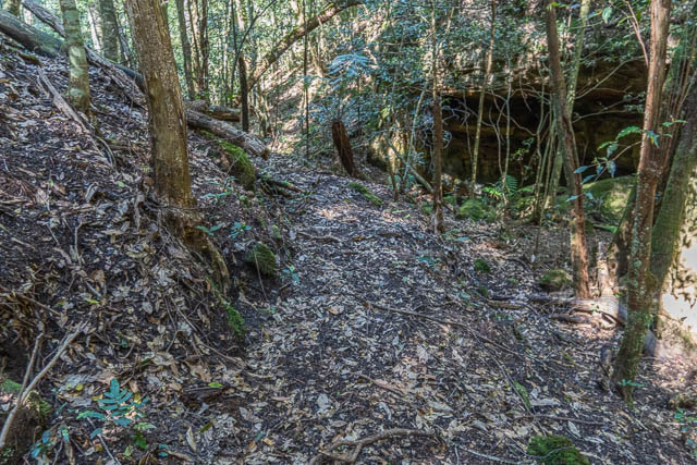Just below the first pagodas on Jinki Ridge, we turned off and followed a side gully down to Jinki Creek. Then we walked downstream. Further down, where the creekbed entered rainforest, we found the signs of an old benched track.