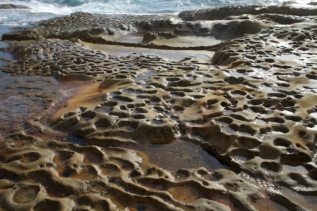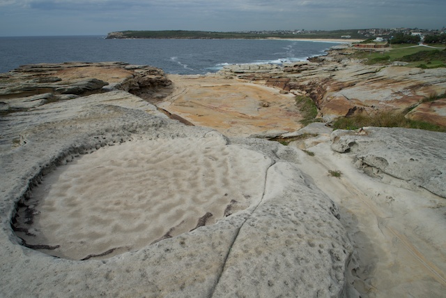 I had never walked south of Coogee, so set of past a few rock pools – past cliffs and swamps, on good paths and boardwalks. Nice walking with great views. The the path seemed to end. I had the Coastal Walking App on my phone – so checked the route here – you have to go up a road, along a short way, then back down another road, then through a narrow gap between houses to find a set of stairs down to the rock platform. None of this route was signposted.