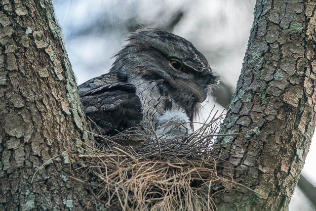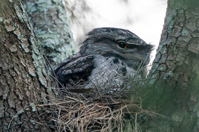 On my way home, I checked out the pair of nesting Tawny Frogmouths near Younger Avenue. They seem unchanged –