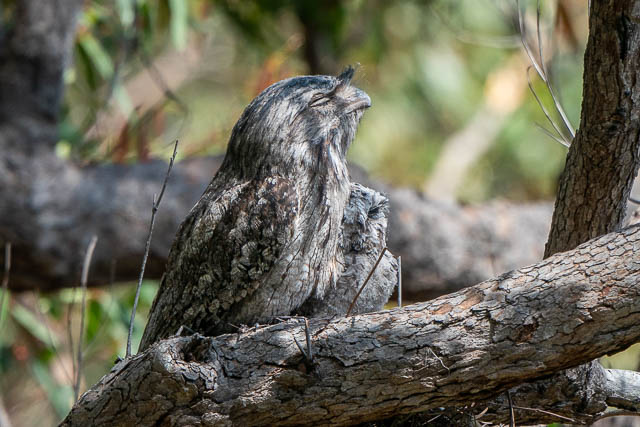 We then headed down one of the roads to check out a Tawny Frogmouth nest. Here is the female perched in a tree near the nest –