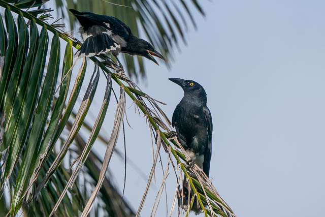 Because of the adults’s yellow eye and white patch around its tail, they must be Pied Currawomgs, not Australian Ravens I think.