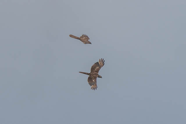 Off in the far distance, I spotted two raptors flying together. I though at first they may be the second chick and the other parent. But no – they are two Brown Goshawks.