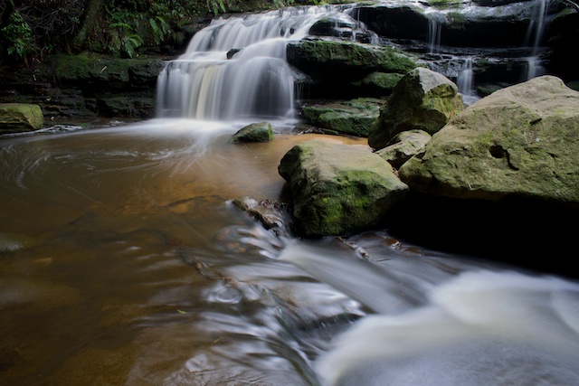 I started off at Leura Cascades. The track was quite wet, it seems to be poorly drained. But it meant that the waterfalls had a good flow from recent rain. The rain seemed to be holding off OK so there were plenty of opportunities to set up a tripod and take photos.