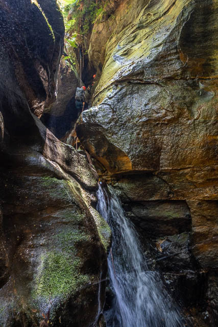 There are actually four waterfalls, after you scramble down below a giant boulder. Each abseil involves descending to a pool, then a swim across and a lower section of abseiling. Here is Rossco descending the upper part of the first abseil –