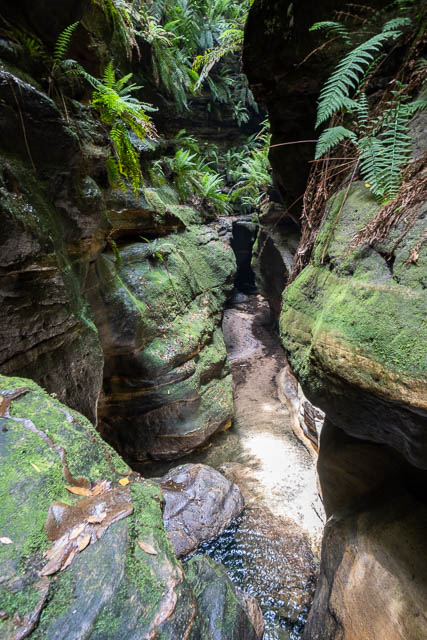 We met another party at the last swim. They had been down Claustral Canyon. After a break we climbed out and around to Rainbow Ravine. Then up that to emerge into the heat above. We stopped for a rest on a rock, then continued on to the causeway that connects Camels Hump to Mt Tomah. At the start of the causeway, there is a turn off track that follows a short-cut route back towards the entrance gully for Claustral. This route seems to be used by some commercial and private parties, but NPWS ask canyoners to go across the causeway and follow the old track down into the upper part of the canyon, then continue downstream to reach that same Claustral entrance gully, and exit up it.