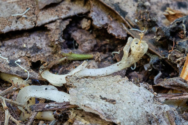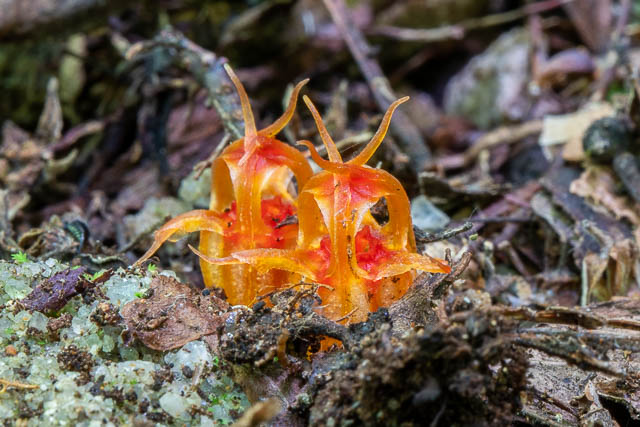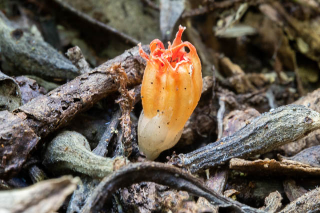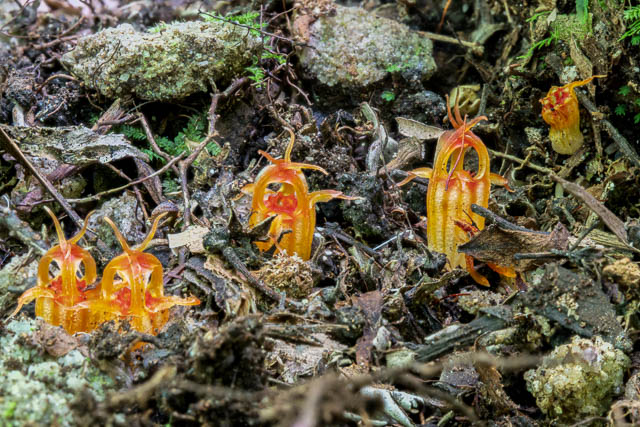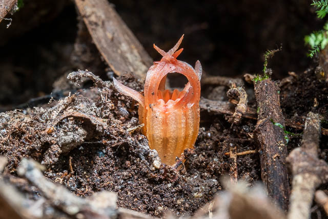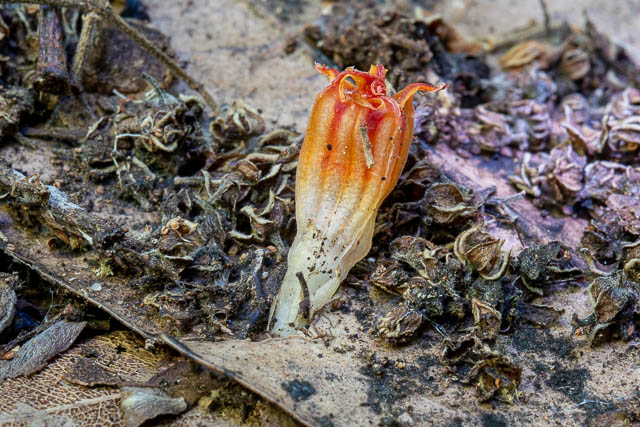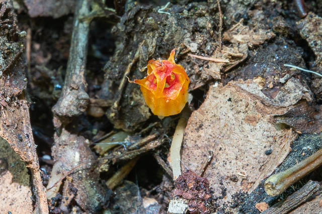 When there are good conditions for fungal fruiting – just after lots of rain, then as fungi appear above the ground, the flowers of the Thismia also appear in the leaf litter. The flowers are very small and would be easy to overlook.