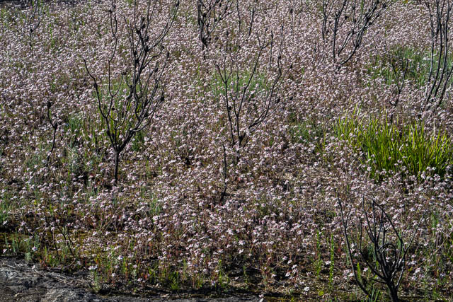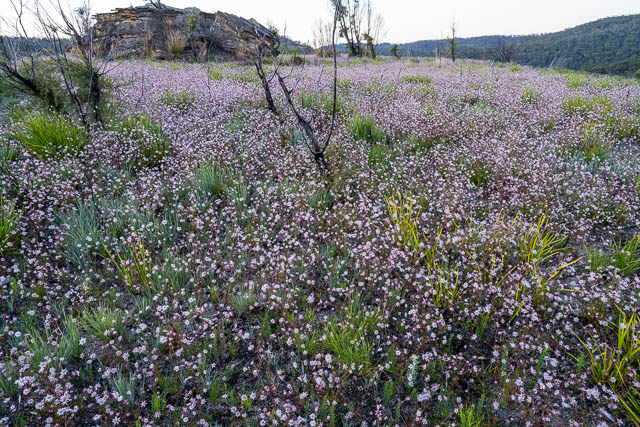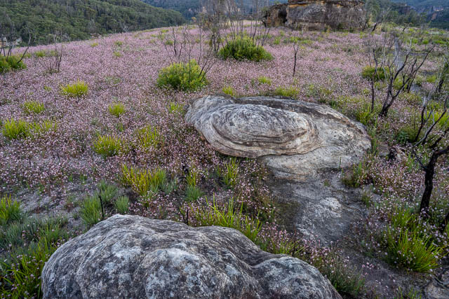 This stunning display of pink Fallen Flowers should remain for a few more weeks at least. Perhaps there will still be flowers in April? Some others have described the pink Flannel Flower display as a “Once in a Lifetime Experience”. Well, I would disagree with that. I have been fortunate enough to see amazing displays of them at Kanangra Walls back in March 2010, and then on Narrow Neck in February and March 2014, and in a lot of places (February – March 2015) after the extensive bushfire on the Newnes Plateau late in 2013. When conditions are right these flowers seem to appear in caespitose profusion. It is these conditions that are rare – a bushfire and then good rain. The bushfires of the previous summer were so extensive, burning out such a large part of the Blue Mountains and well beyond, that it is likely, that anyplace that contains dormant pink Flannel Flower seeds will now have a good display of flowers.