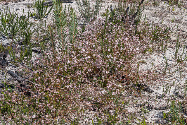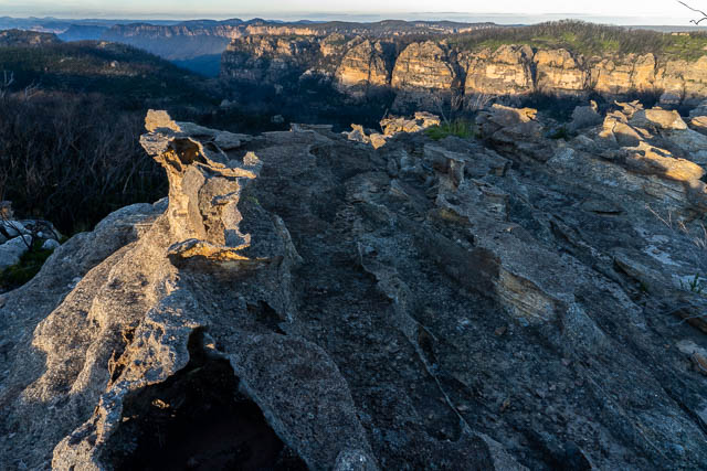 This area is adjacent to part of the tops known as “The Exploded Pagoda”. Its a great spot for dawn and dusk photography. But in the harsh mid-day sun, photography was difficult. As well as the rocks close by, there were lots of pink Flannel Flowers. A best past their prime perhaps.