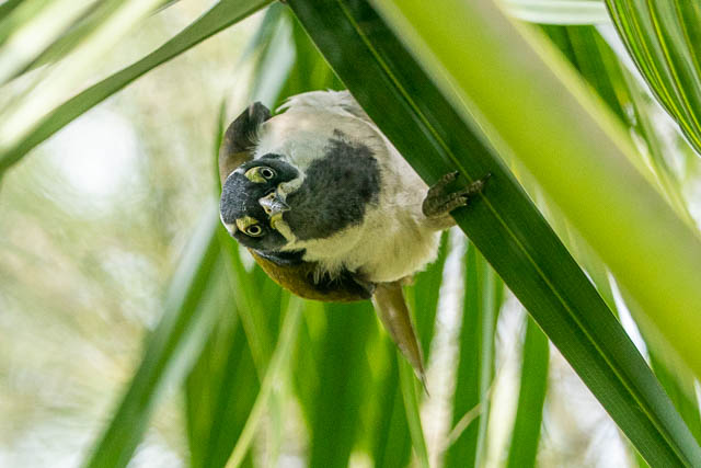 I had to move around a bit to follow the bird as it moved from palm to palm. It was often obscured behind fronds. Finally it found some food – a nice caterpillar.
