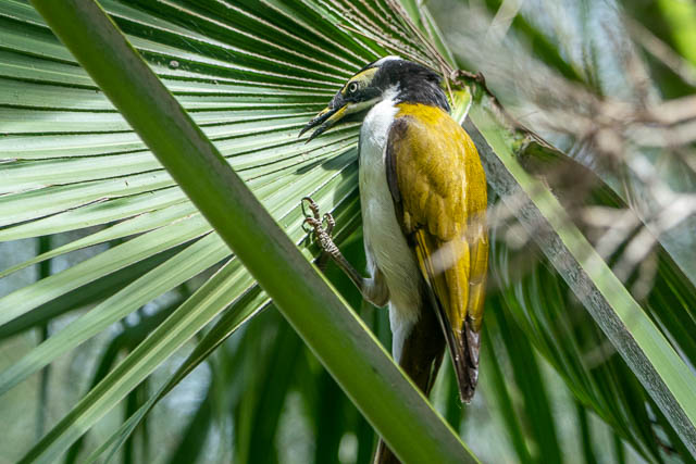 And then the quiet period. Nothing special seen despite a lot of looking in places I had seen interesting birds before. I ventured back to one of the small ponds where I had often seen Azure Kingfishers on previous visits. Again none seen. But I heard a bird higher up in the palm trees. It was a Blue-faced Honeyeater. It stayed around for a while – searching for food.