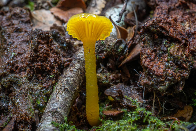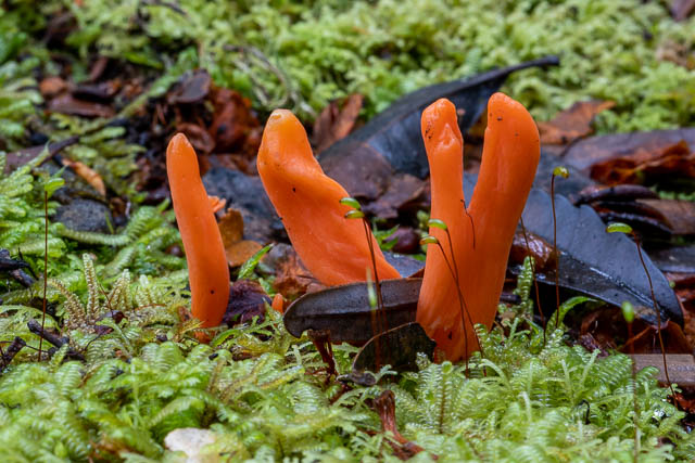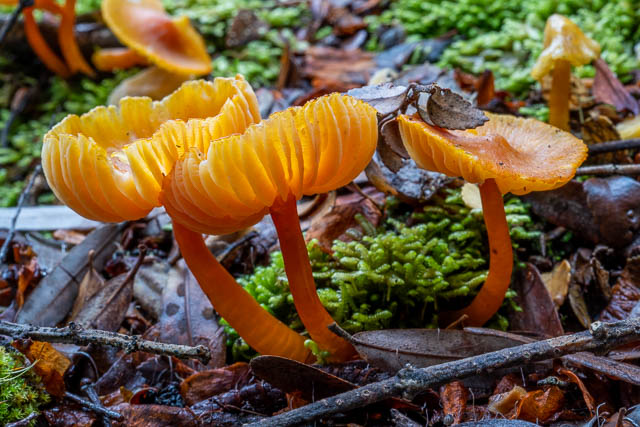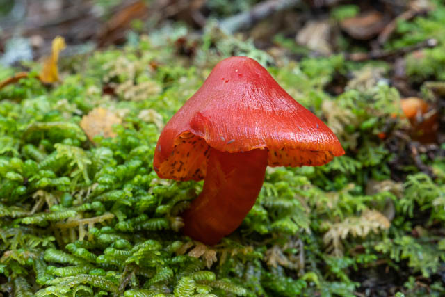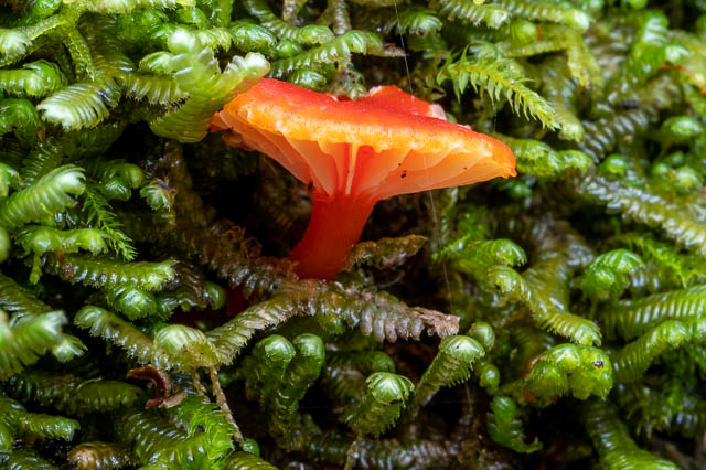 These red waxcaps were growing from the end of a log. This is unusual – waxcaps are supposed to only grow on soil. I did see plenty of others growing on moss covered logs.