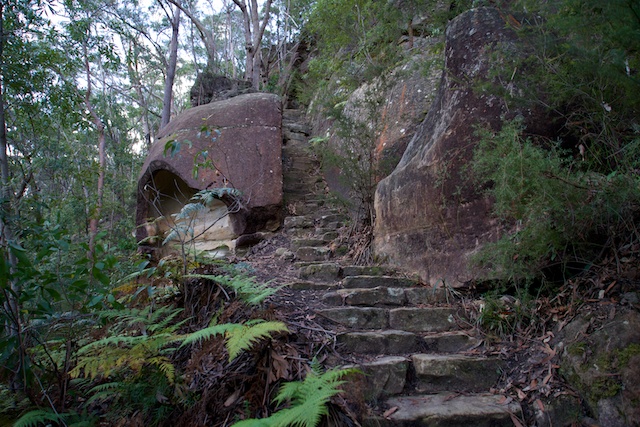 The track continues up the creek, well above the creek, which is confined in a narrow rainforest gorge below. Eventually the track drops down to the creek and crosses it a few times before climbing up some old steps to Florabella Street in Warrimoo.