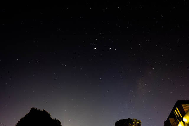I was also after some photos showing the background stars if possible, which should be now visible in the period of total eclipse. It would have been great to be at dark sky site, like in the Blue Mountains, and I had contemplated travelling there. But wind was forecast – so conditions may have been difficult. Instead I used a “expose to the right” technique. This involved using setting close to what you would use in a dark site, deliberately over exposing the photo due to light pollution. Then by post processing darkening the image. This worked out reasonable well. You can see lots of background stars and even the glow of the Milky Way.