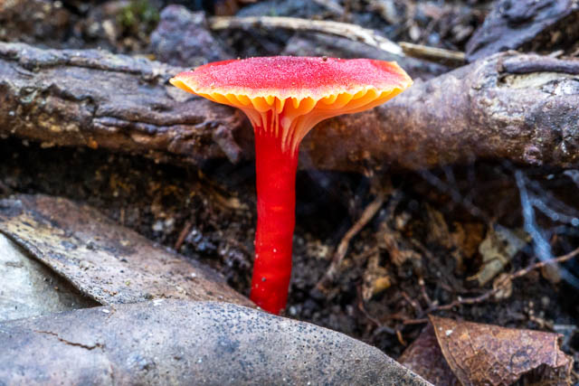 Crossing Bola Creek and walking upstream. I found more waxcaps. Here are some Hygrocybe reesiae –