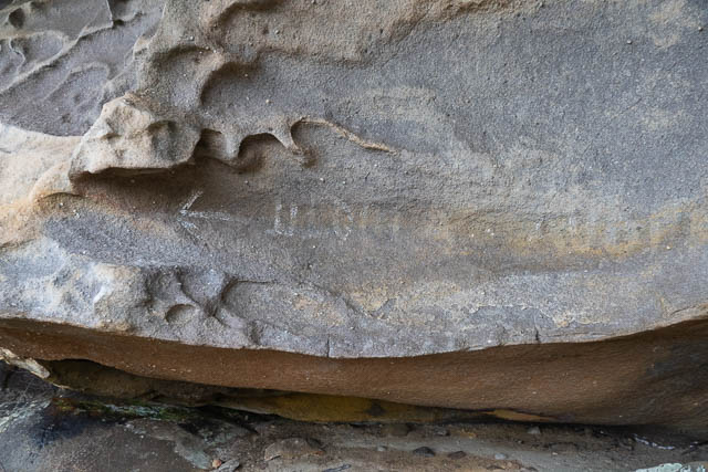 We then spotted an overhang under the rock. Could it have art? No, but we did find an old track sign – with Uloola and Audley and arrows. In the past, the track must have gone around the rock on that side.