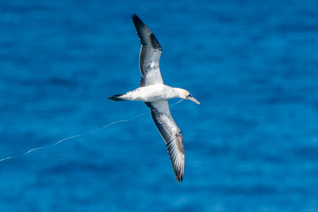 I photographed a Gannet flying past, and only raised when I was looking at the photo that it had been hooked by a fishing line that seems to be embedded in its mouth. Not good!