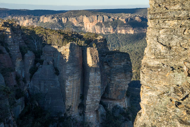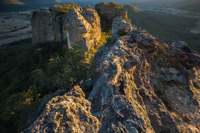 This section of Donkey Mountain is quite thin. There are great views of both side of the Wolgan Valley. The best views are looking towards the two towers that lie to the south west. To the east we could see a tourist resort down in the valley. Looking along the north side of the mountain, we could see some the ends of some of the slots that cut through that part of the mountain. Donkey Mountain is quite small in extent but very complex.