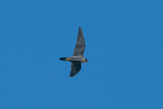 I spotted a Peregrine Falcon flying high above.