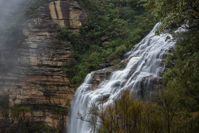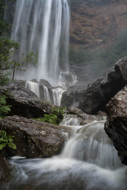 I continued down to the top of Wentworth Falls and down the track to the bottom of the upper falls. Here a continual blast of spray from the torrent made photography very trying. I then went along National Pass, which offered great views of the two major falls that make up Wentworth Falls.