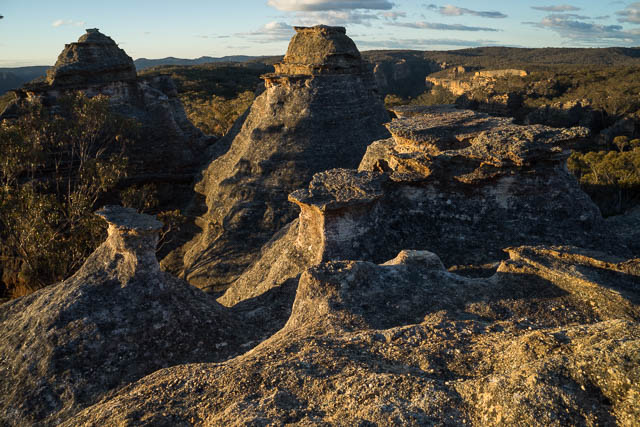 These three sites feature the very special “plate” type pagodas, as distinct from the rounded rock formations that are found in other parts of the Gardens of Stone (and in other places like the Bungle Bungles). The plate type formations seem to be unique to the western edge of the Greater Blue Mountains.