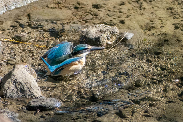 I don’t now whether the Kingfisher caught crab and swallowed it on the ground or if the dive was unsuccessful. They do often eat small crabs while on the ground. Larger ones they take to a perch and then stun it by banging it on the branch.