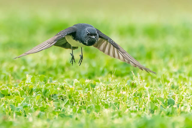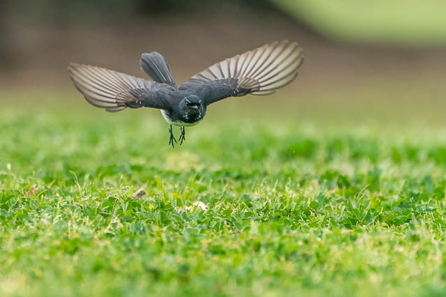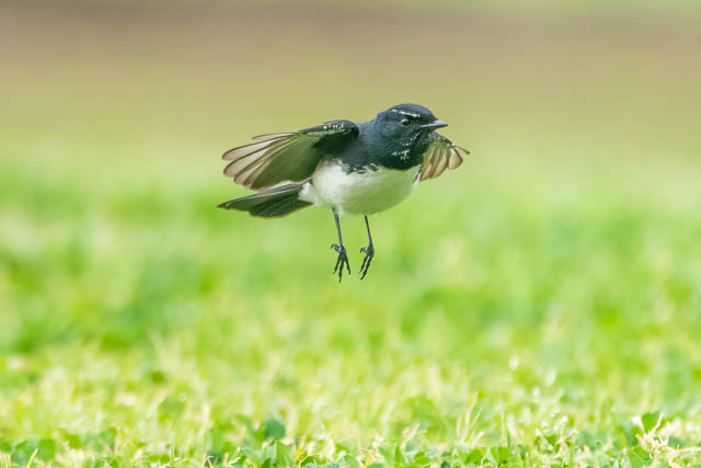 I waited for a while, to see if it would fly back. It didn’t, so I looked around for some other birds. A Willie Wagtail was hunting on the grass.