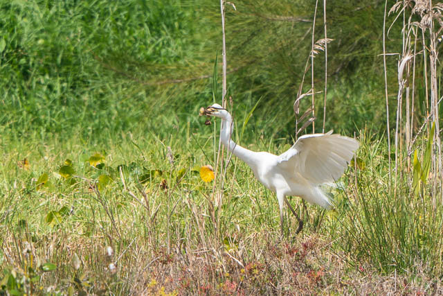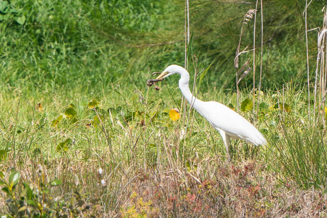 Then I noticed a Great Egret behind the pond. It was a long way off, but I could see it had caught a small snake.