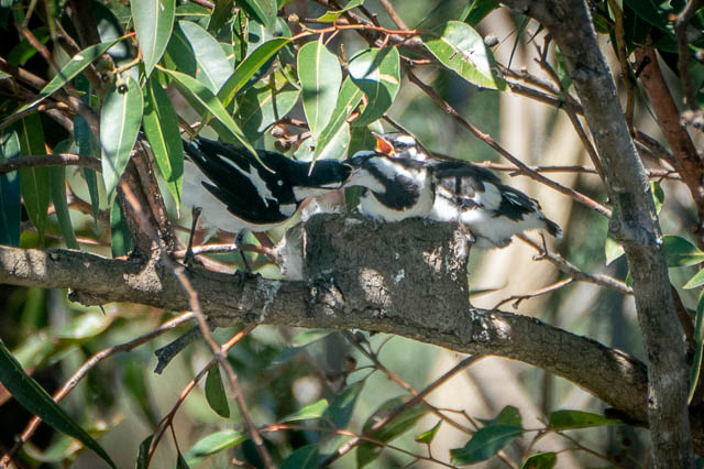 A Magpie Lark is returning with food for its chicks.