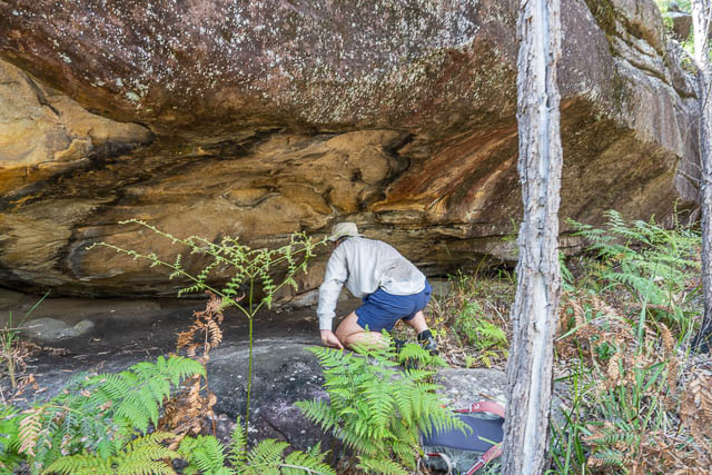 We had a most interesting walk, finding a number of art sites. The first area we looked at was an open woodland, and here we examined all the overhangs we could see. Many of these had been used as occupation shelters – there was a lot of evidence of discarded shells, and I think three of them had hand stencils.