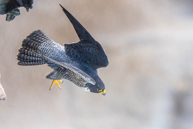I then missed the best photos of the day, when its mate returned with prey. It flew in very fast with a rather large bird and went straight to the nest ledge. The guarding Peregrine then joined it.