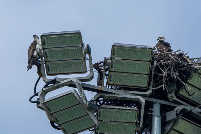 I caught a B-line bus from Wynyard to Warriewood and walked the short distance to Rat Park. As I approached I could see an Osprey perched below their nest. The other Osprey, the male, was sitting higher near a light.