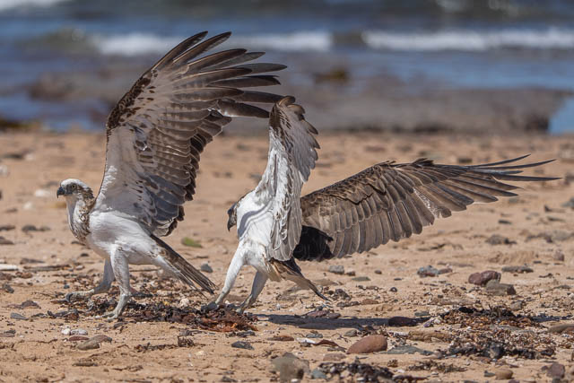 I could happily have stayed longer, but I wanted to check out some other sites. So I walked back to the bus stop and caught a bus to the turn-off to Long Reef. I walked out to the lookout. I knew when I arrived that there must be some interesting birds about because there were three or four other bird photographers around. I soon spotted a pair of Osprey perched on the steep slope.