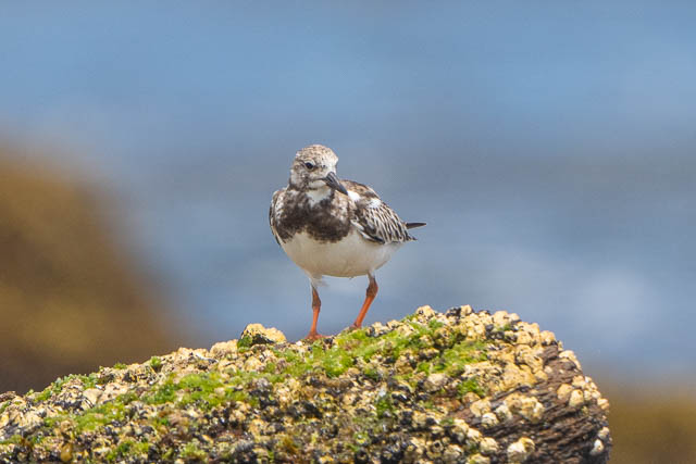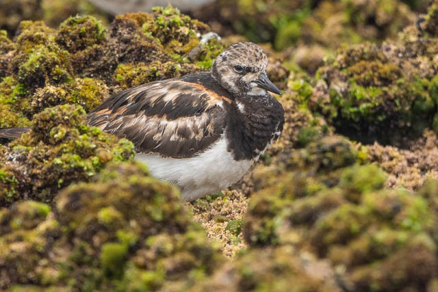 The small birds are named because they turn over stones to look for food. Here there are few small stones on the platform, but they are still busy foraging.