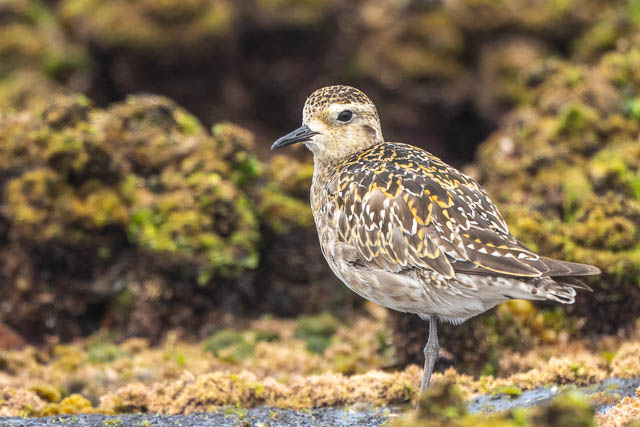 And mixed with the Stints are a smaller number of Pacific Golden Plovers –