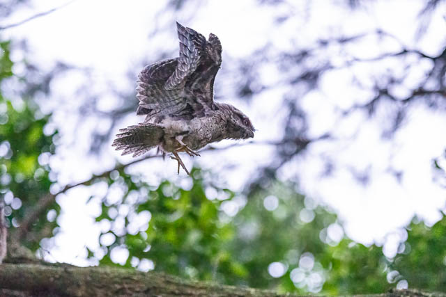 I was after photos of them flying, so I waited to see what would happen. I arrived a little after 7 pm, and watched them quietly. At 7:26 pm the parent all of a sudden and very quietly took off and flew to perch in a nearby tree.