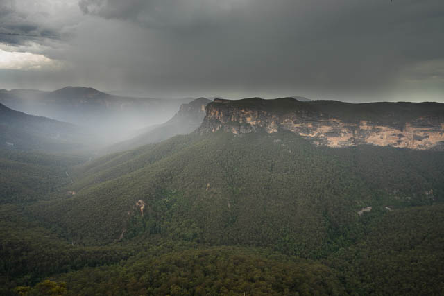 After visiting the canyon, we walked back to the car via the track to Evans Lookout. Just after we arrived at the lookout, the forecast thunderstorm also arrived over and we were able to obtain refuge in a shelter shed right at the lookout.