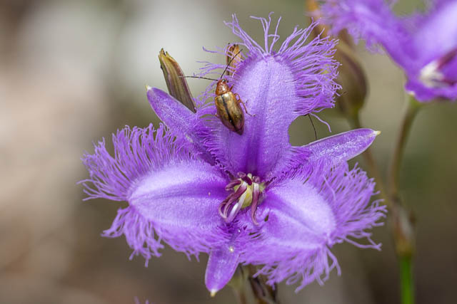 These small beetles seem to be eating the Fringe Lily flowers. The flower normally only last for a single day.