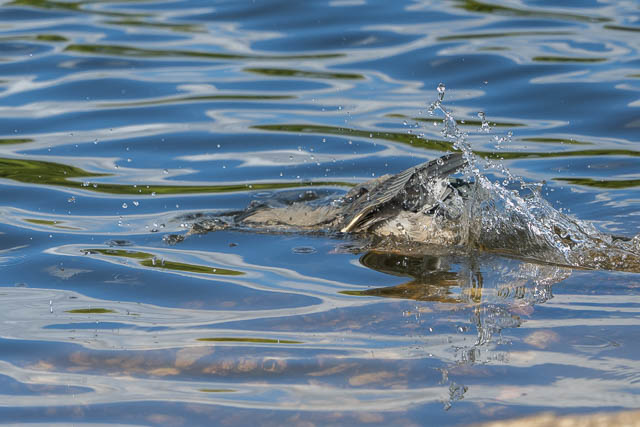 The Heron climbed up the bank a bit and swallowed the fish out of my sight. It then resumed its hunting. I watched it for another 25 minutes or so. It remained focussed on the water and occasionally extended its neck, but it never pounced. It then flew off. I wonder if it is feeding young?