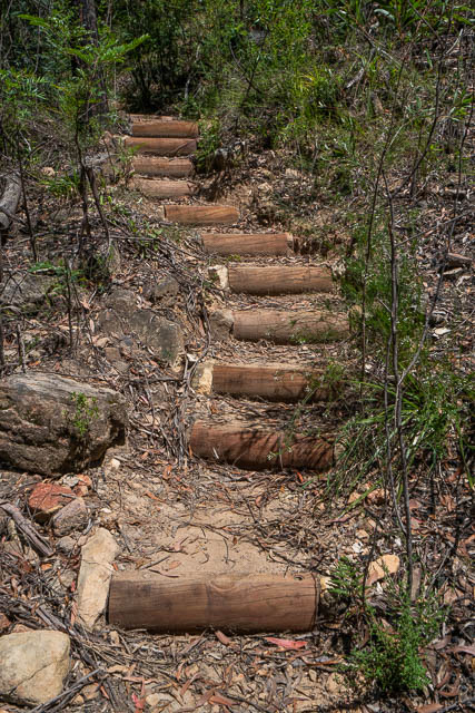 So we set off from Mt Wilson on a hot day. On the way down we passed a group of track workers building a new track down to the canyon. The new track work started at the Blue Mountains National Park boundary which is fair way down the track, where the basalt ends.