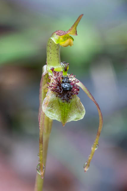Above Clarinda Falls, the creek traverses an area not in rainforest. Its good place to look for orchids. I found a cluster of Wasp Orchids – Chiloglottis seminuda –
