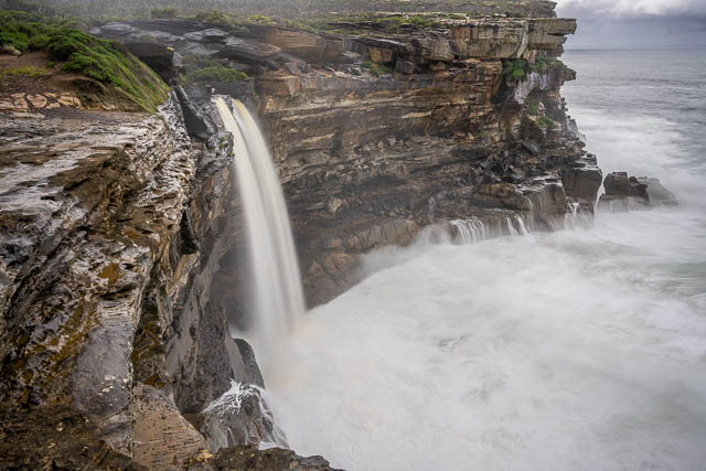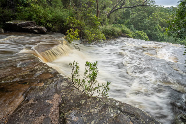 There is also a high waterfall here. Perhaps the highest in the area as it starts from a greater elevation. But it is very tricky, and also dangerous in these conditions, to get a good photo of the whole waterfall. I first spotted this waterfall from a long way off – from the lookout at Otford at the start of the Coastal Track. This was at dawn when I saw the sun shining on the waterfall.