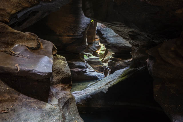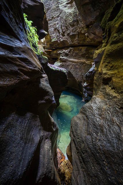 The Lower Constriction is not much different than before. We bypassed the tunnel section by climbing over it- that is still easy. Logs have blocked up a short drop further downstream and it best now abseiled. Then the main abseil – into the lower dark bit. This takes you to the heart of the canyon – a turquoise pool of exquisite beauty and one of the few swims of the canyon. We spent a lot of time in the section with our cameras and tripods.