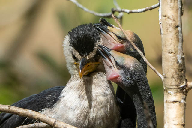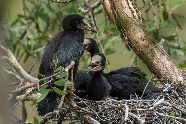 Not far away was another nest with larger Little Pied Cormorant chicks. A parent had just arrive and the chicks wanted to be fed.