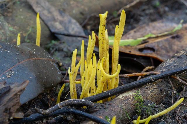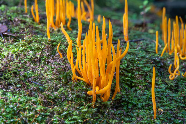 Then along the small side creek was a large area covered with coral fungi. Its colour ranged from orange to yellow. Possibly all Clavulinopsis amoena.
