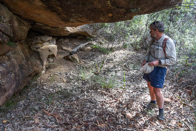 You can read about the rediscovery of this old track by Jim Smith and Wilf Hilder in a series of articles in Hut News (Blue Mountains Conservation Society). Part 1 and Part 2. Part 2, in an old article, describes a large cave near the creek used by Sir Alfred Stephens. This would be that cave.