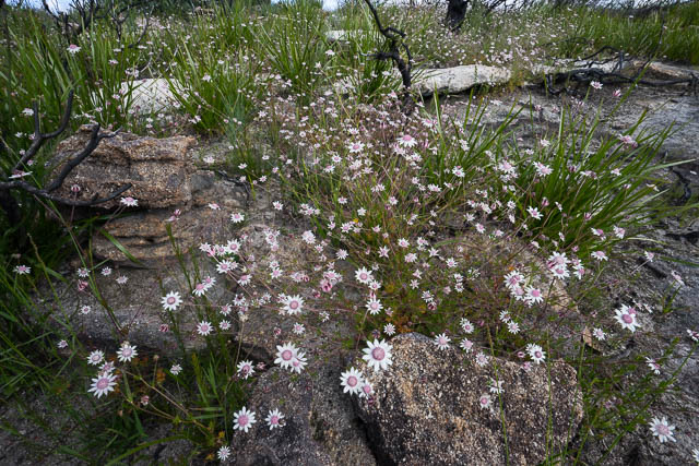 John and myself, then took Jasper for a walk up the creek, and we noticed more climbing areas and also a patch of pink flannel flowers – Actinotus forsythii. There does seem to be a lot of this seldom seen flannel flower out at present. The dormant seeds seem to only germinate about a year after a bushfire and also need a period of rain. When these conditions are met – you can suddenly get a carpet of small pink flowers. We were to spot much more of this plant over the weekend.