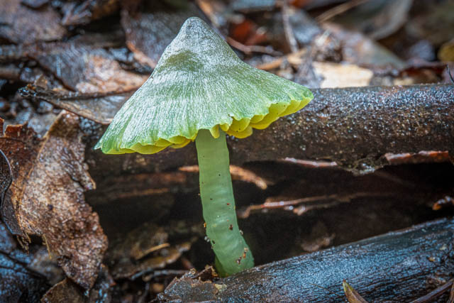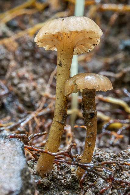 When I saw these, I thought they could be Gliophorus psittacinus. In the gloomy forest it was hard to see the correct colours. But later looking at the photos it seems to have distinct pink tinge to the cap and the green colour is quite light. They are certainly very viscid – so probably Gliophorus sp. One possibility is Hygrocybe iropus. I only found the two.