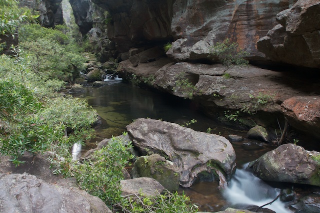 There is a track going down to a little below the junction of Du Faurs Creek and the Wollangambe, but most people turn of that track and take a short cut to the start of the canyon. You may want to look at Tom Brennan’s Guide