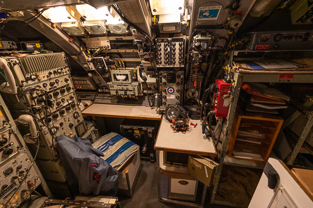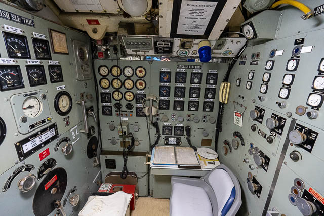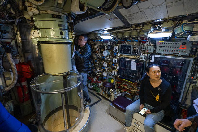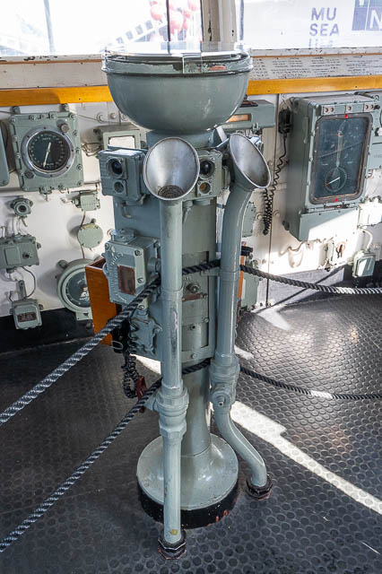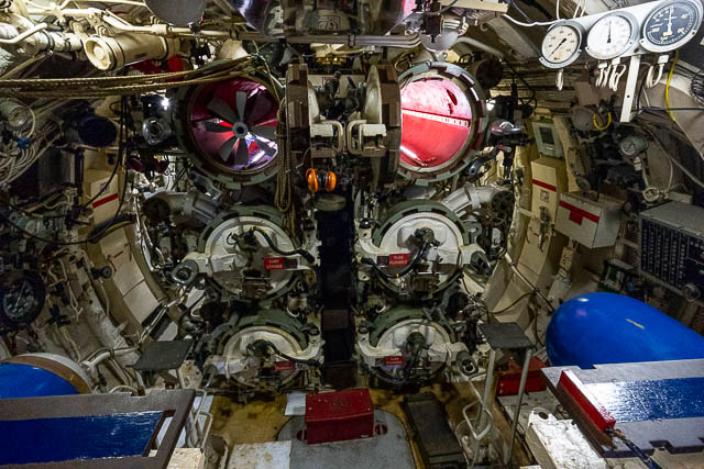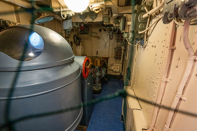 Here there were two periscopes – one used to aim and fire torpedos, and the other used by the watch person to look around. It was fitted with a seat that rotated with the periscope.
